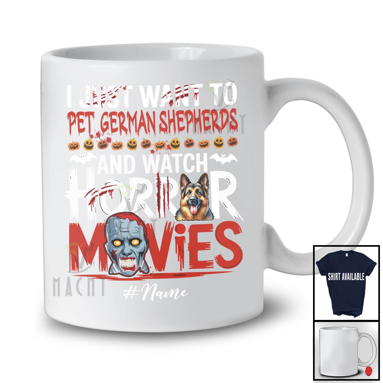 Personalized Custom Name Pet German Shepherds Watch Horror Movies; Creepy Halloween Zombie T-Shirt. This cotton t-shirt is a durable staple product with a classic fit. One of the most popular items, it has a relaxed style made for everyday and casual wear.