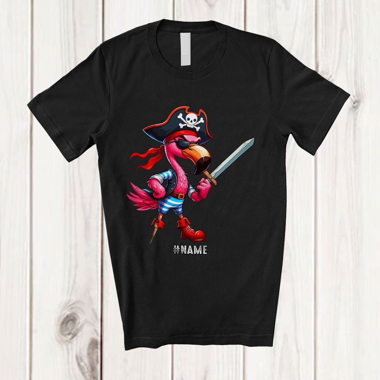 • Personalized Custom Name Pirate Pink Flamingo; Scary Halloween Flamingo Farm Animl; Farmer Family T-Shirt. This cotton t-shirt is a durable staple product with a classic fit. One of the most popular items, it has a relaxed style made for everyday and casual wear.