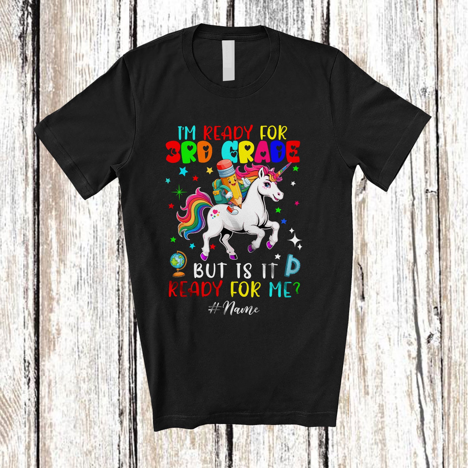 Personalized Custom Name Ready For 3rd Grade; Amusing First Day Of School Pencil Riding Unicorn T-Shirt. This cotton t-shirt is a durable staple product with a classic fit. One of the most popular items, it has a relaxed style made for everyday and casual wear.