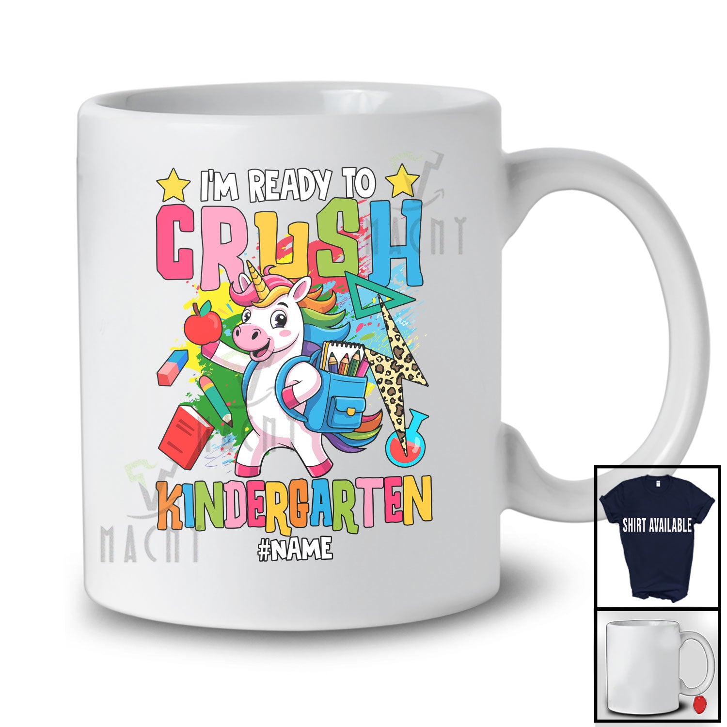 Personalized Custom Name Ready To Crush Kindergarten; Lovely Back To School Unicorn Teacher T-Shirt. This cotton t-shirt is a durable staple product with a classic fit. One of the most popular items, it has a relaxed style made for everyday and casual wear.