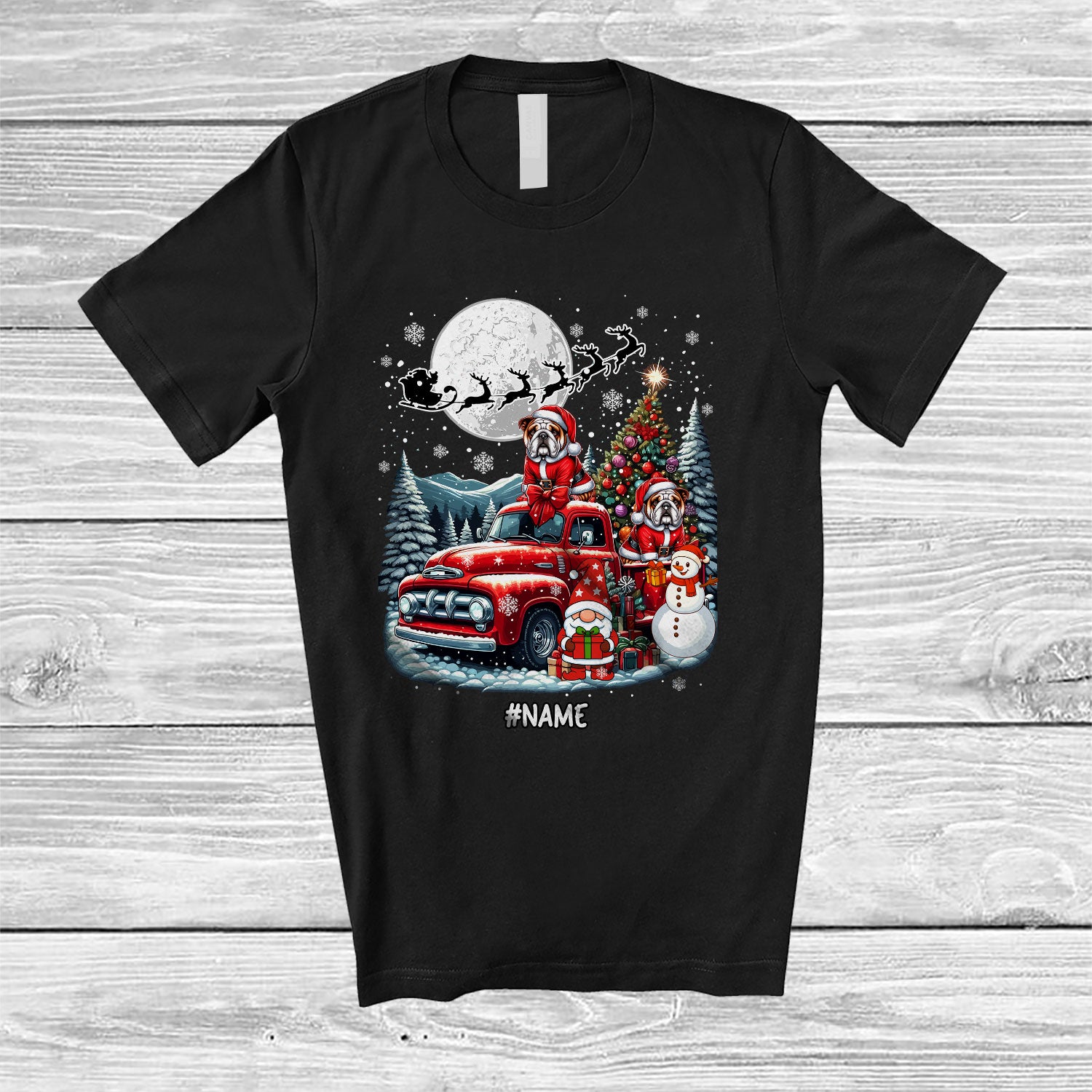 Personalized Custom Name Santa Bulldog On Pickup Truck; Joyful X-mas Tree Winter Landscape T-Shirt
