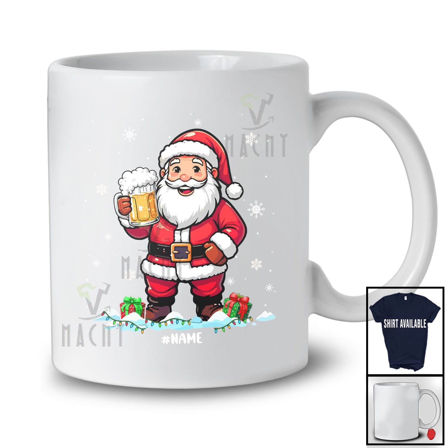 • Personalized Custom Name Santa Drinking Beer Glasses; Amazing Christmas Light Snow Drinking T-Shirt. This cotton t-shirt is a durable staple product with a classic fit. One of the most popular items, it has a relaxed style made for everyday and casual wear.