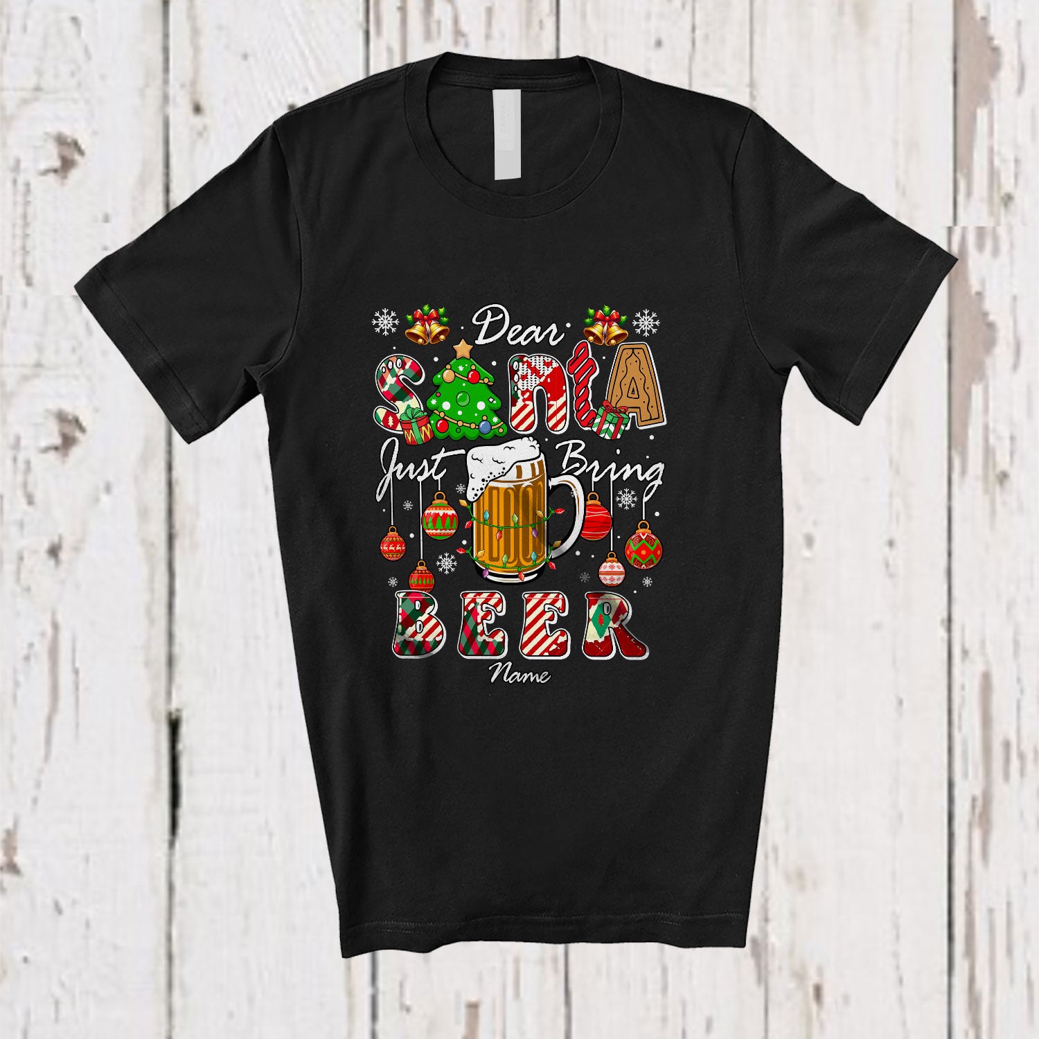 Personalized Custom Name Santa Just Bring Beer; Awesome Christmas Tree Drinking Drunker T-Shirt. This cotton t-shirt is a durable staple product with a classic fit. One of the most popular items, it has a relaxed style made for everyday and casual wear.