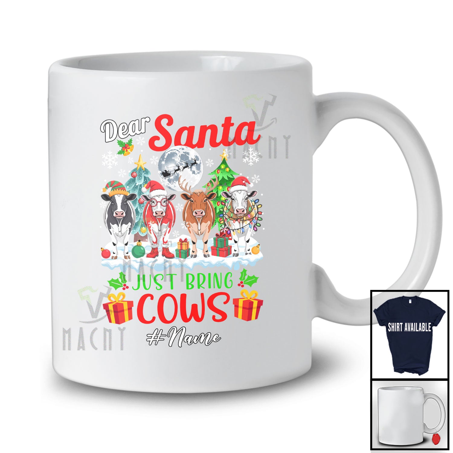 Life is too short to live without the Personalized Custom Name Santa Just Bring Cows; Joyful Christmas Moon Trees Four Animals T-Shirt. Be happy. Be Content. Be Satisfied.