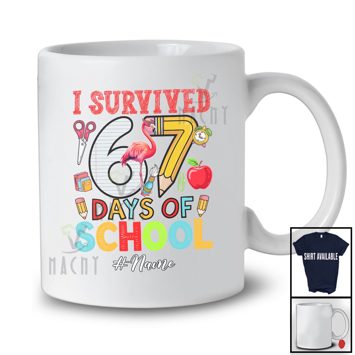 Personalized Custom Name Survived 67 Days Of School; Lovely Flamingo Six Seven Student Teacher T-Shirt. This cotton t-shirt is a durable staple product with a classic fit. One of the most popular items, it has a relaxed style made for everyday and casual wear.