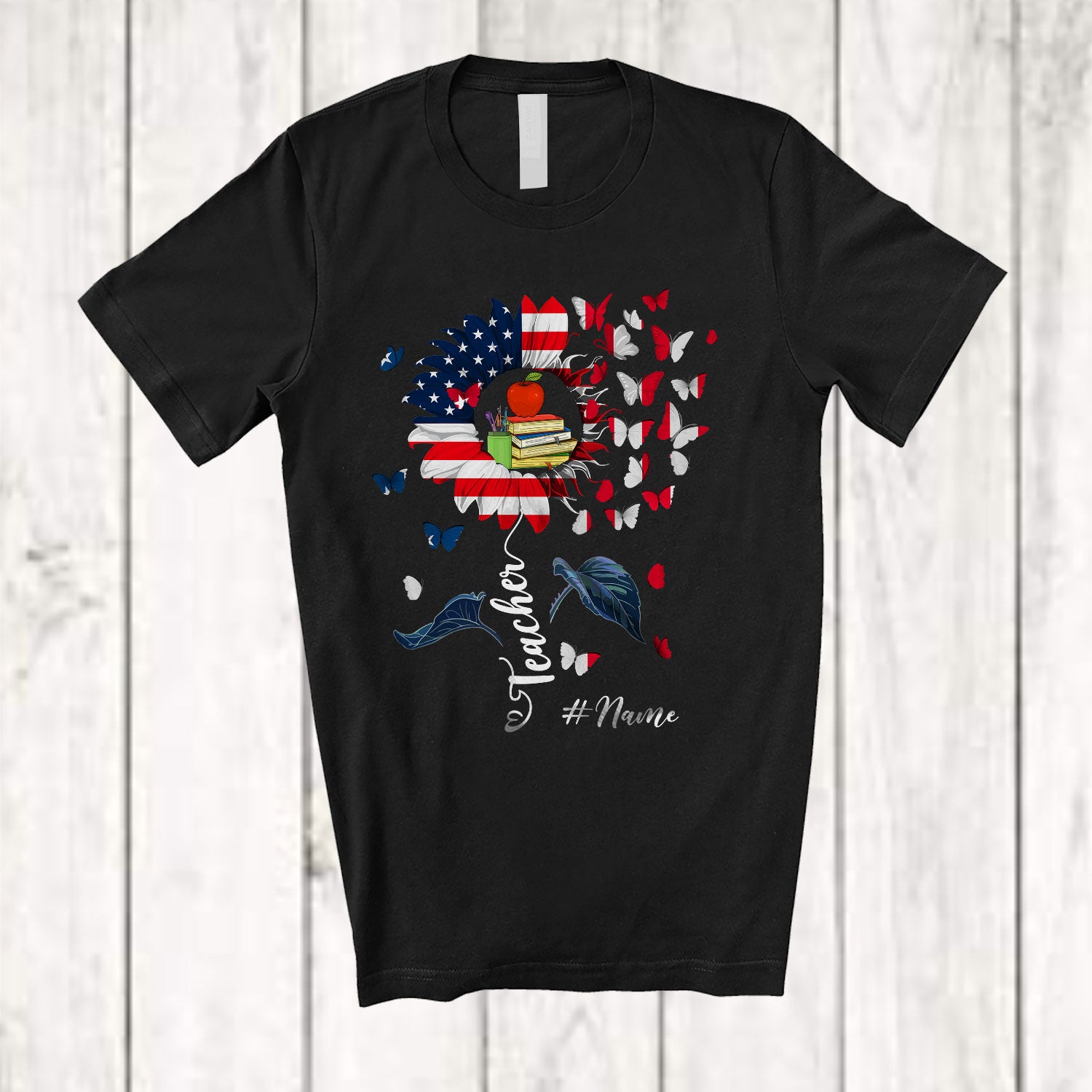Personalized Custom Name Teacher; Lovely 4th Of July US Flag Sunflower; Teaching Patriotic T-Shirt