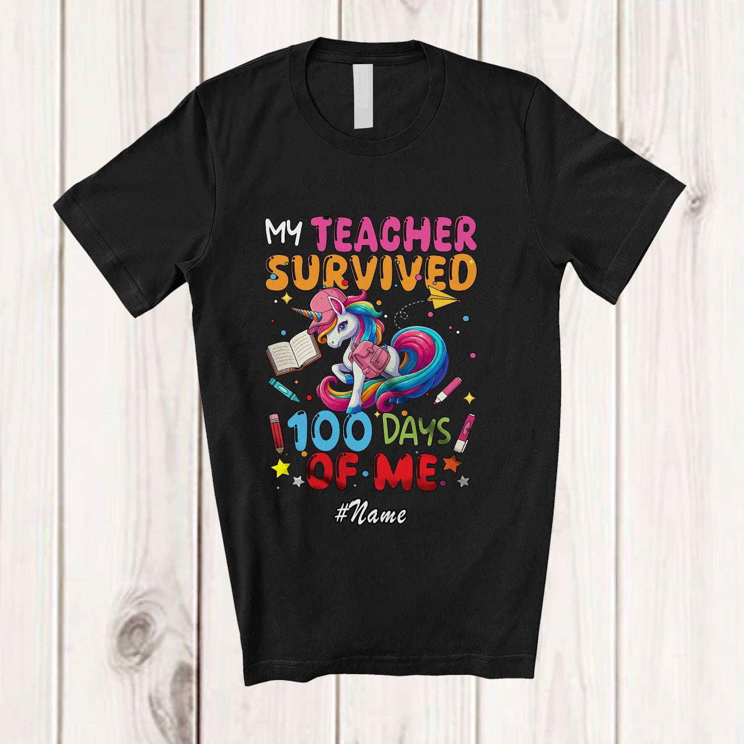 Personalized Custom Name Teacher Survived 100 Days Of Me; Joyful 100th Day School Students Unicorn T-Shirt. This cotton t-shirt is a durable staple product with a classic fit. One of the most popular items, it has a relaxed style made for everyday and casual wear.