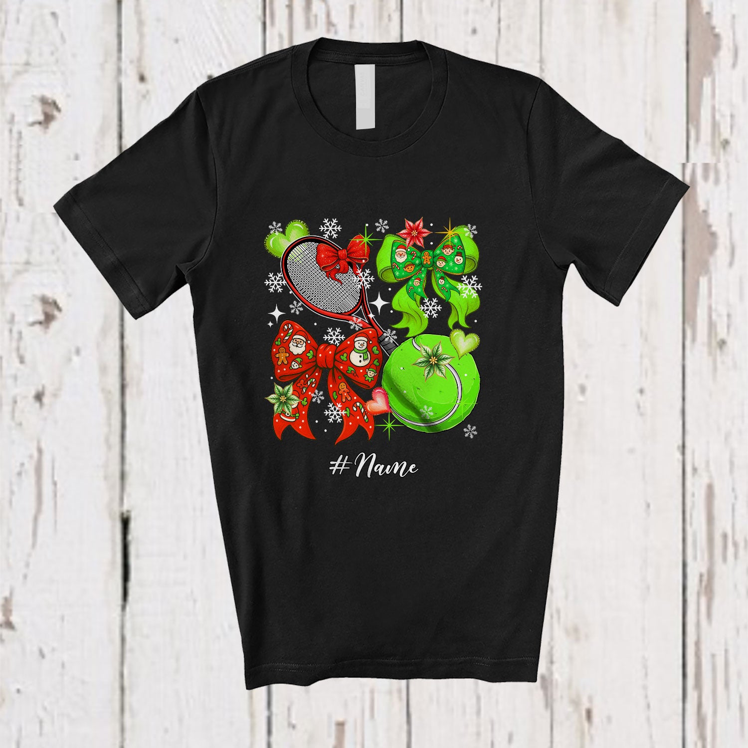 Personalized Custom Name Tennis Christmas Coquette; Lovely Bow Tie Snowing; Sport Player T-Shirt. This cotton t-shirt is a durable staple product with a classic fit. One of the most popular items, it has a relaxed style made for everyday and casual wear.