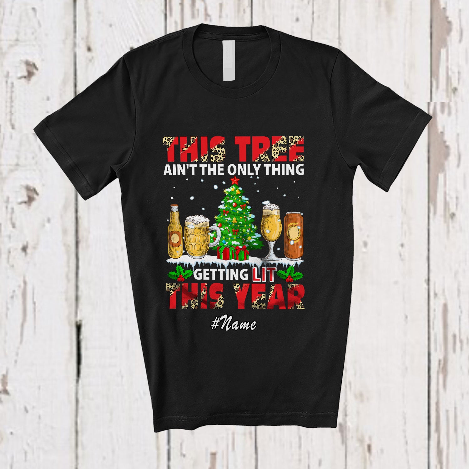 Personalized Custom Name This Tree Ain't Only Thing Getting Lit; Joyful Christmas Beer Drinking T-Shirt
