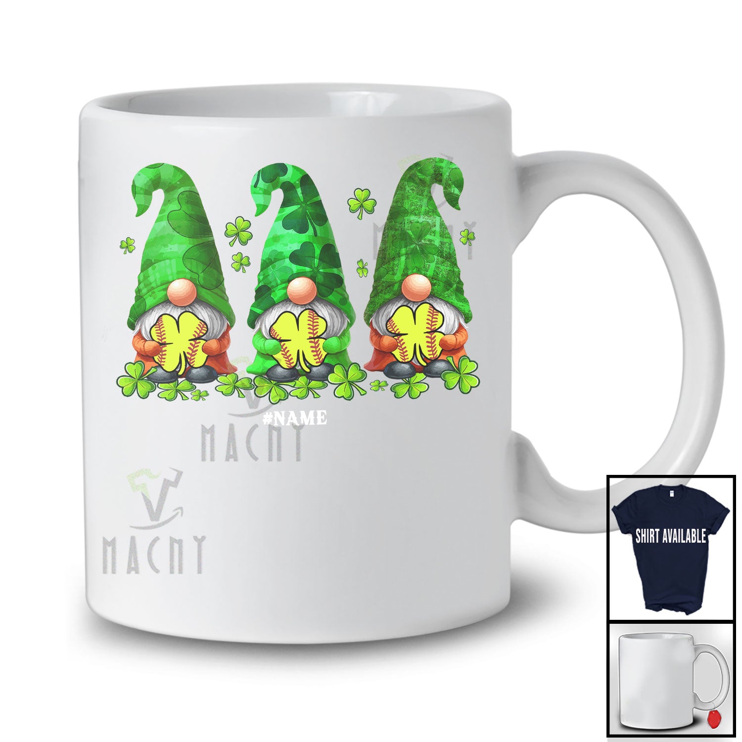 Personalized Custom Name Three Gnomes Softball Player; Lovely St. Patrick's Day Sport Shamrock T-Shirt. This cotton t-shirt is a durable staple product with a classic fit. One of the most popular items, it has a relaxed style made for everyday and casual wear.