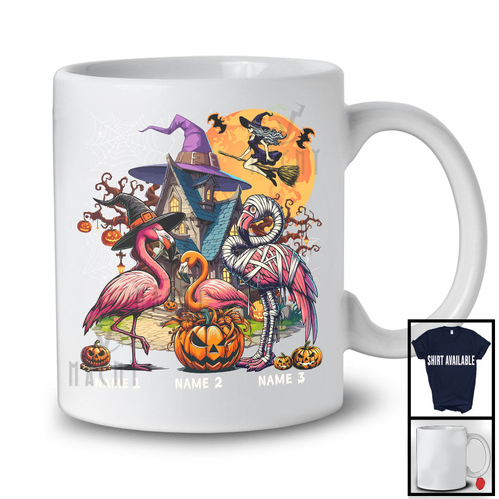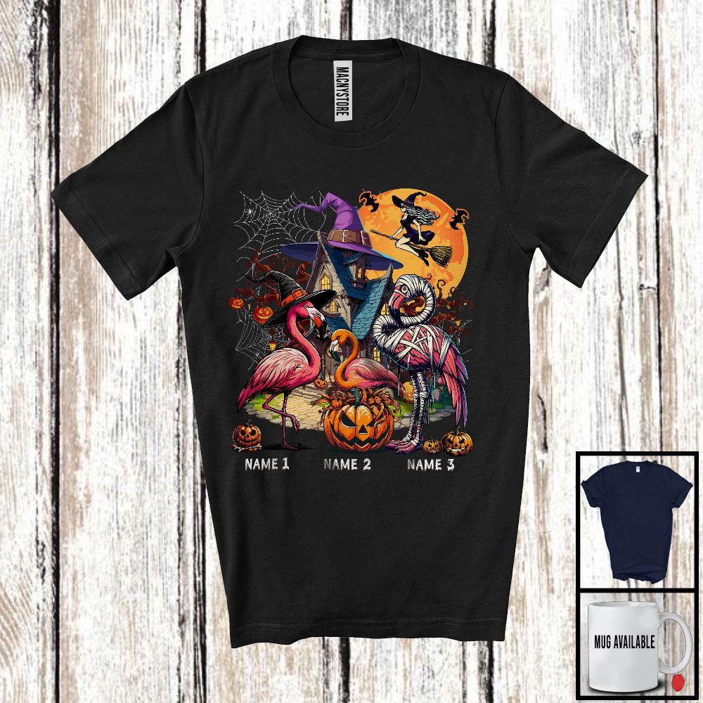 The Personalized Custom Name Three Mummy Witch Flamingo, Scary Halloween Animal Lover, Pumpkin T-Shirt destined to impress, and priced at only $12.95, for a limited time.