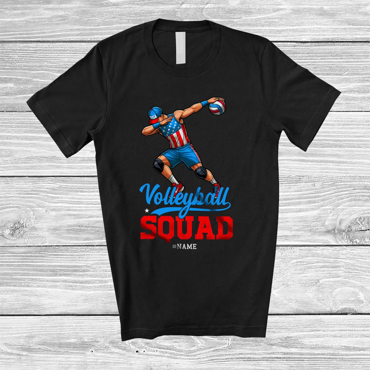 Personalized Custom Name Volleyball Squad; Amazing 4th Of July Dabbing Sport Player; Patriotic T-Shirt. This cotton t-shirt is a durable staple product with a classic fit. One of the most popular items, it has a relaxed style made for everyday and casual wear.