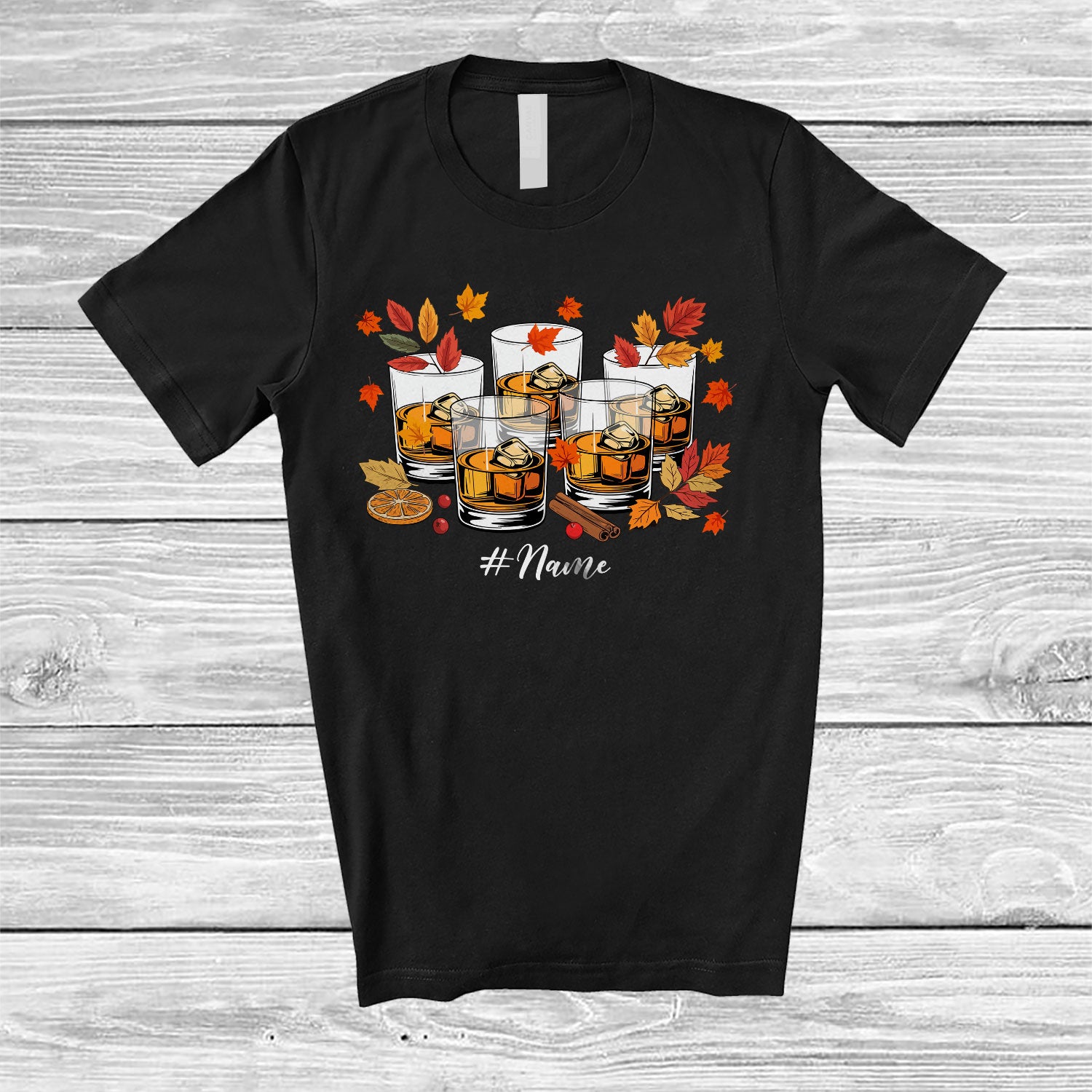 Personalized Custom Name Whiskey Collection Fall Leaves; Cheerful Thanksgiving Drinking Drunker T-Shirt. This cotton t-shirt is a durable staple product with a classic fit. One of the most popular items, it has a relaxed style made for everyday and casual wear.