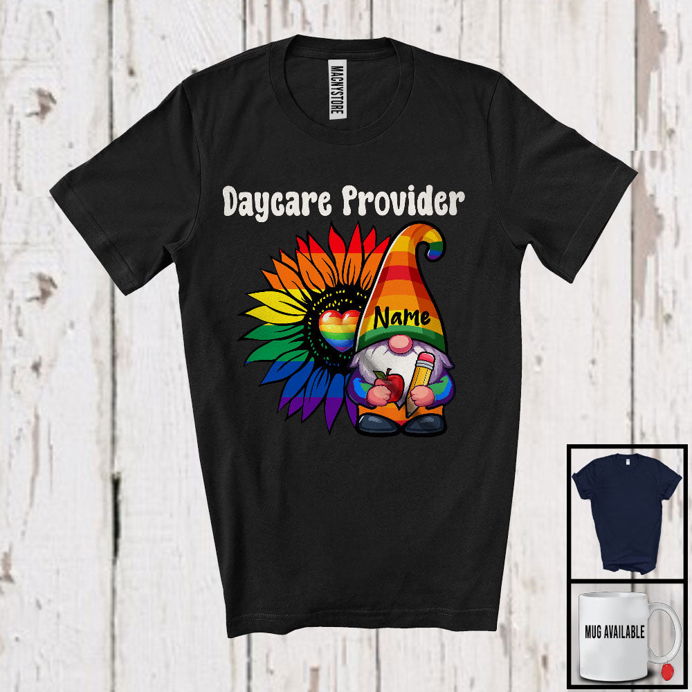 Personalized Daycare Provider, Colorful LGBTQ Pride Sunflower Gnome, Custom Name Gay Rainbow T-Shirt. This cotton t-shirt is a durable staple product with a classic fit. One of the most popular items, it has a relaxed style made for everyday and casual wear.