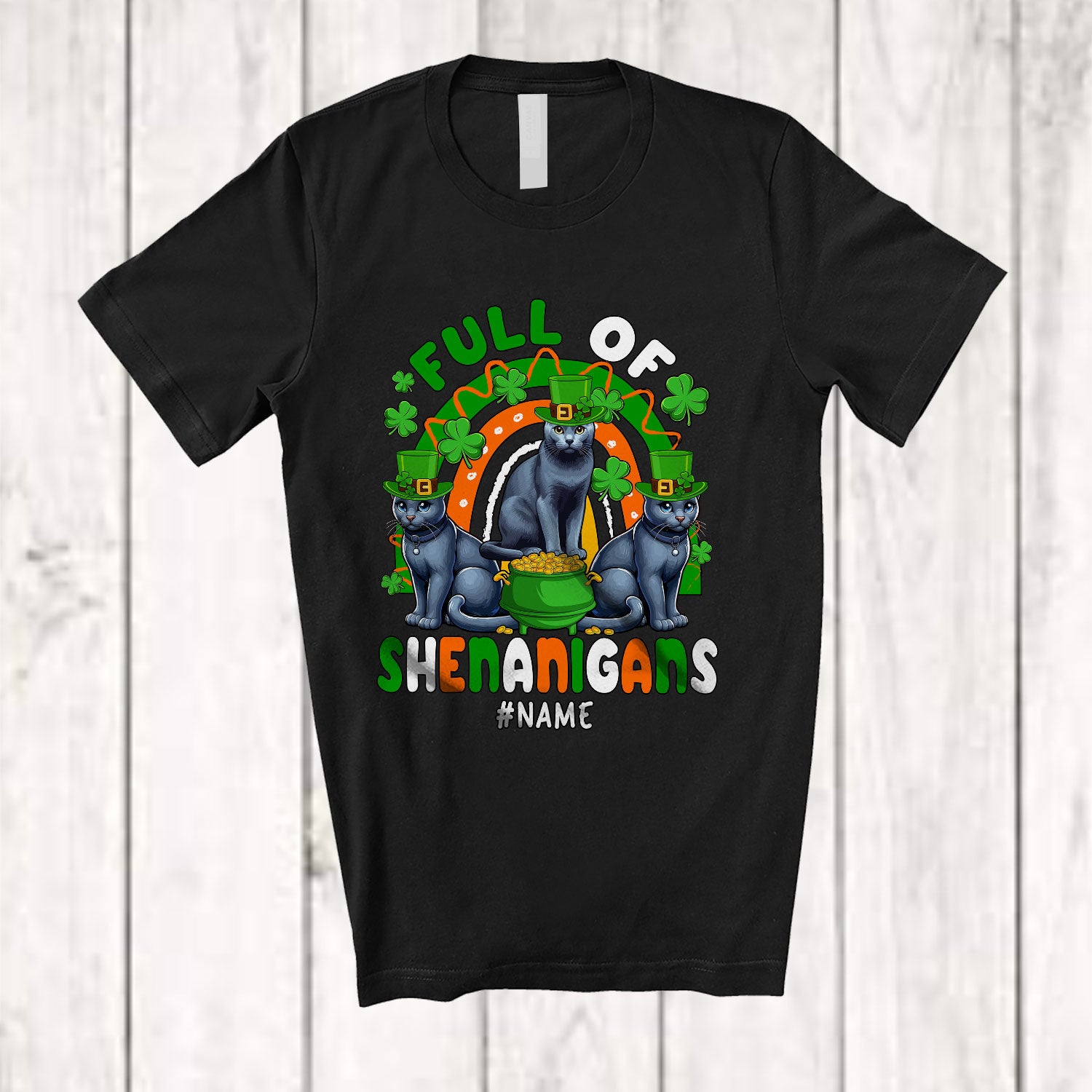 • Personalized Full Of Shenanigans; Lovely St. Patrick's Day Three Russian Blue Cat Rainbow; Family T-Shirt. This cotton t-shirt is a durable staple product with a classic fit. One of the most popular items, it has a relaxed style made for everyday and casual wear.