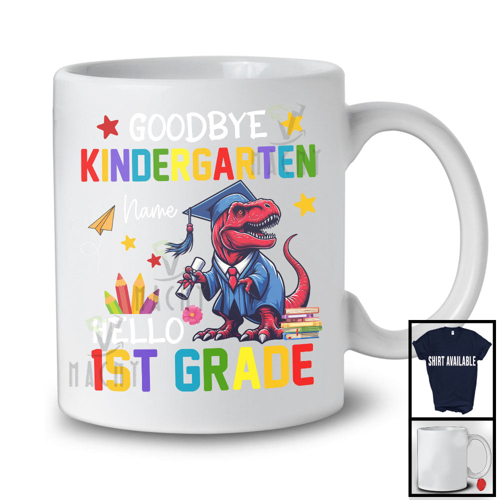 Personalized Goodbye Kindergarten Hello 1st Grade, Joyful Summer Vacation T-Rex, Custom Name Graduate T-Shirt