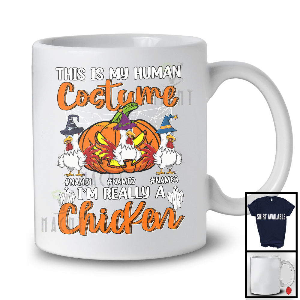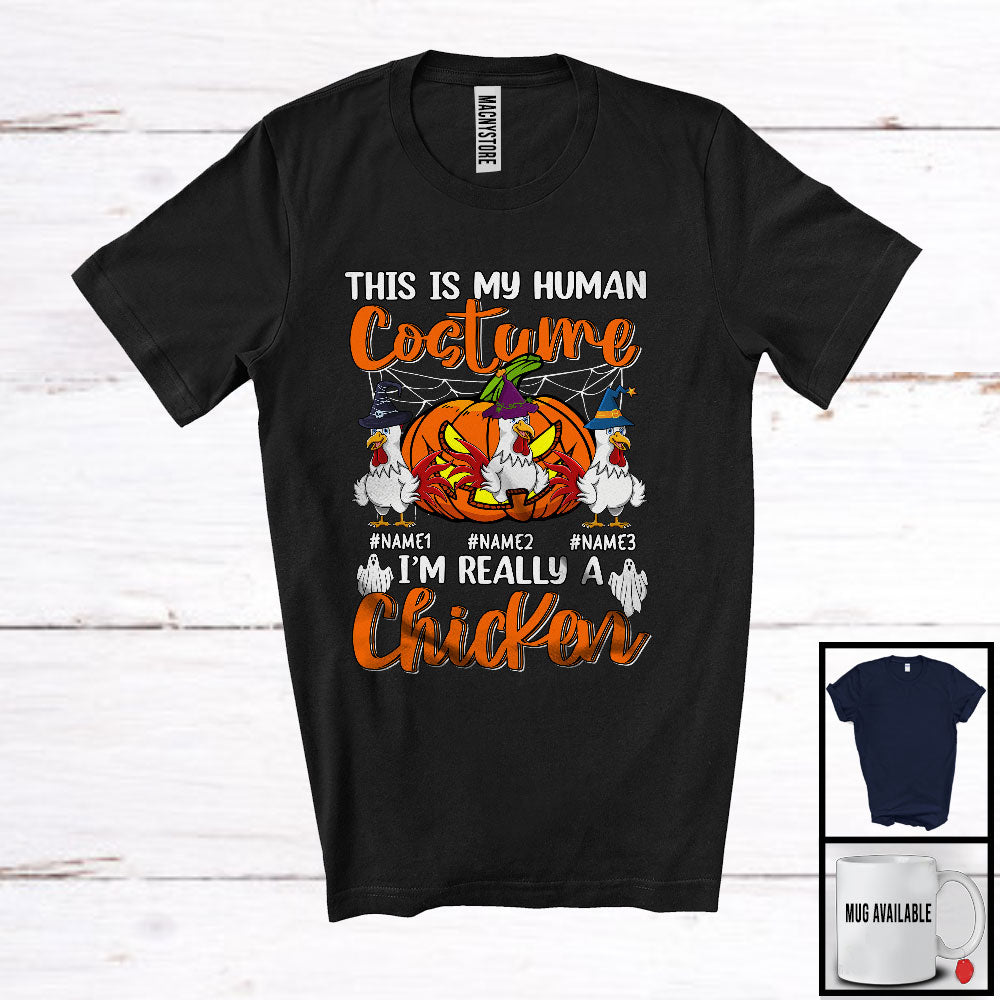 • Personalized Human Costume I'm Really A Chicken; Horror Halloween Custom Name Farmer T-Shirt. This cotton t-shirt is a durable staple product with a classic fit. One of the most popular items, it has a relaxed style made for everyday and casual wear.