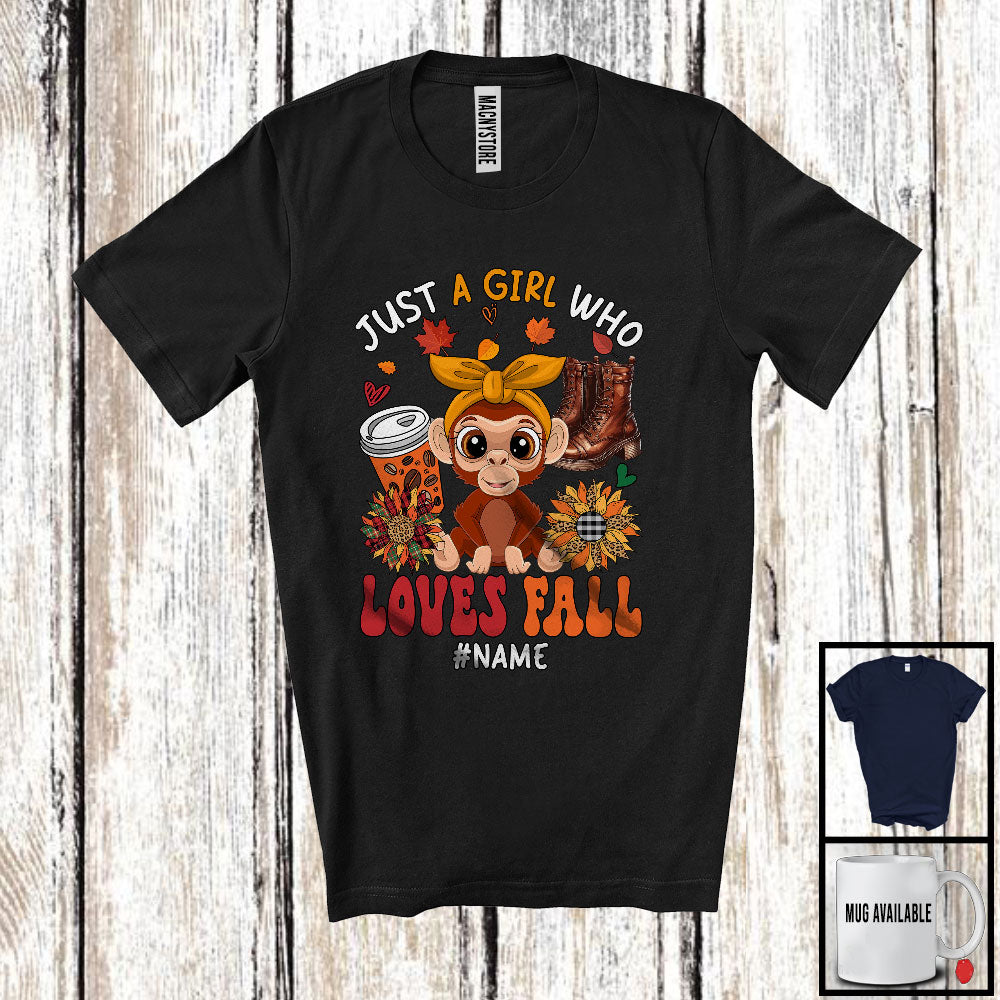 Personalized Just A Girl Who Loves Fall; Adorable Custom Name Monkey; Fall Plaid Sunflowers T-Shirt