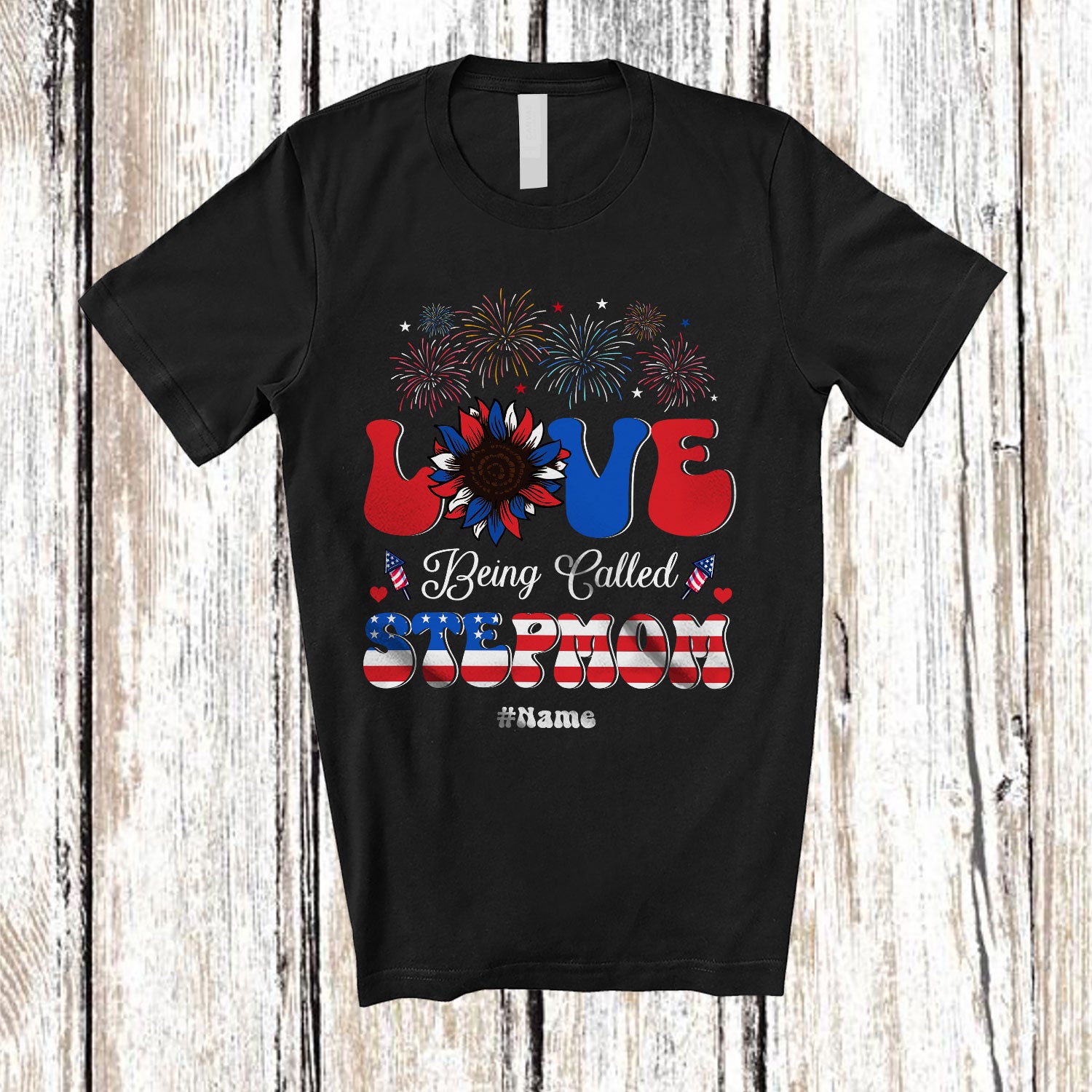Personalized Love Being Called Stepmom; Cheerful 4th Of July Sunflower; Custom Name Patriotic T-Shirt. This cotton t-shirt is a durable staple product with a classic fit. One of the most popular items, it has a relaxed style made for everyday and casual wear.