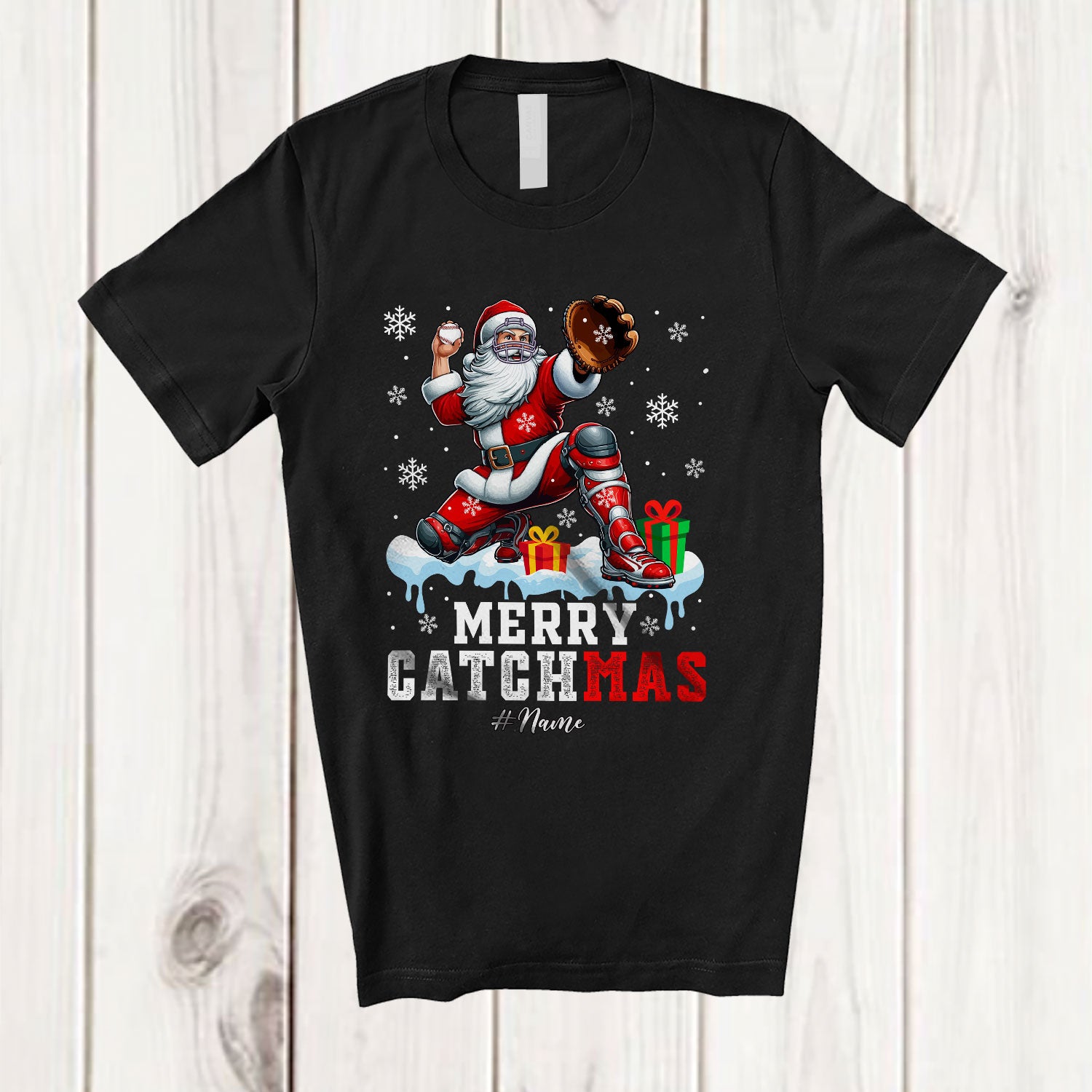 Personalized Merry Catchmas; Fantastic Christmas Custom Name Santa Baseball Catcher Player T-Shirt