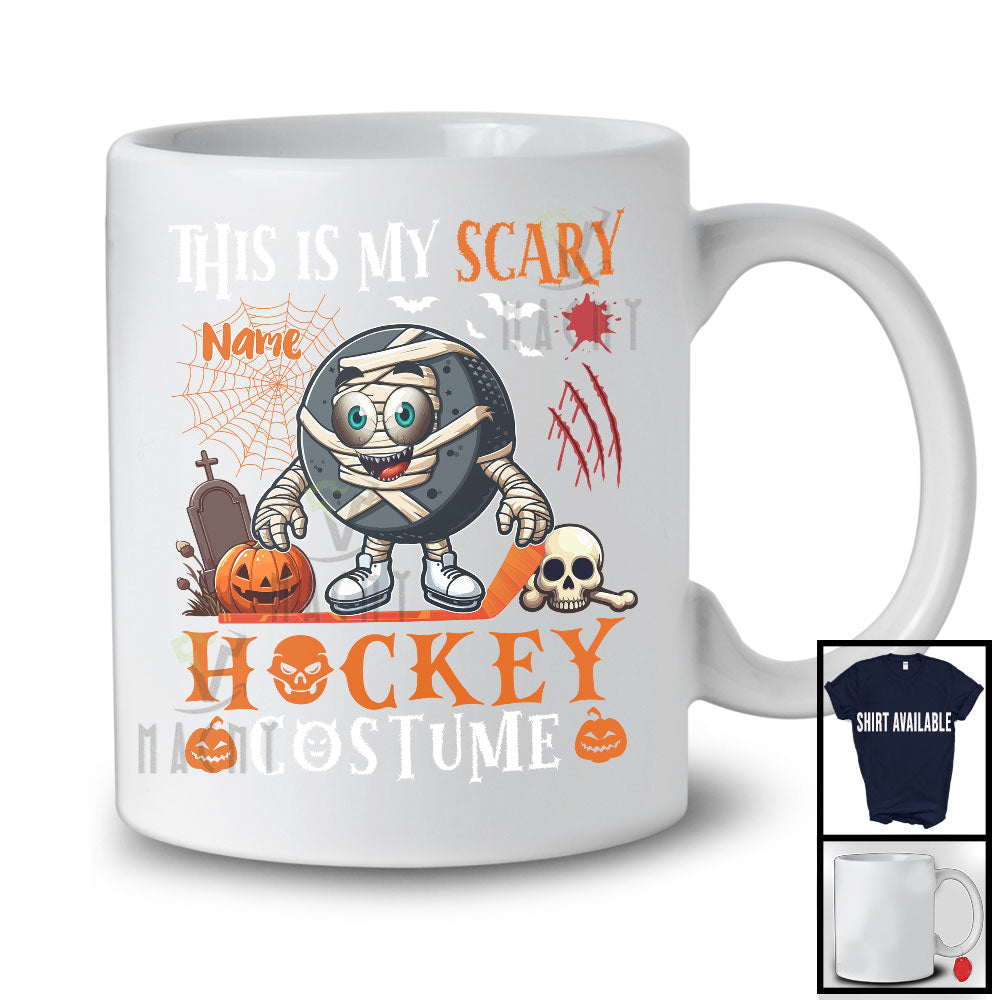 • Personalized My Scary Hockey Costume; Cool Halloween Custom Name Mummy Puck; Sports T-Shirt. This cotton t-shirt is a durable staple product with a classic fit. One of the most popular items, it has a relaxed style made for everyday and casual wear.