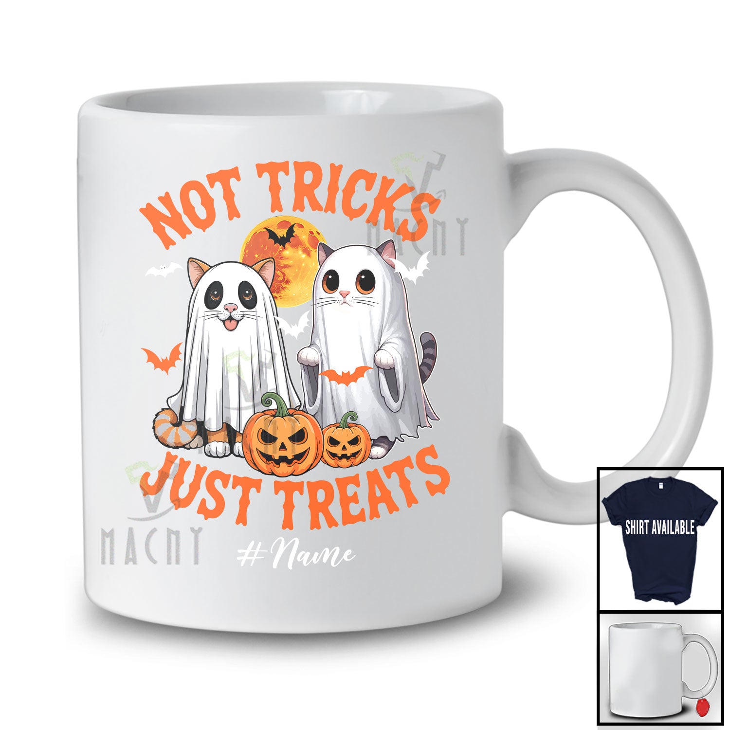 This Personalized Not Tricks Just Treats; Creepy Halloween Custom Name Two Boo Ghost Cat Owner T-Shirt is great idea gift for your family, friends in this birthday, christmas, mother's day, father's day, patrick's day or any holiday.