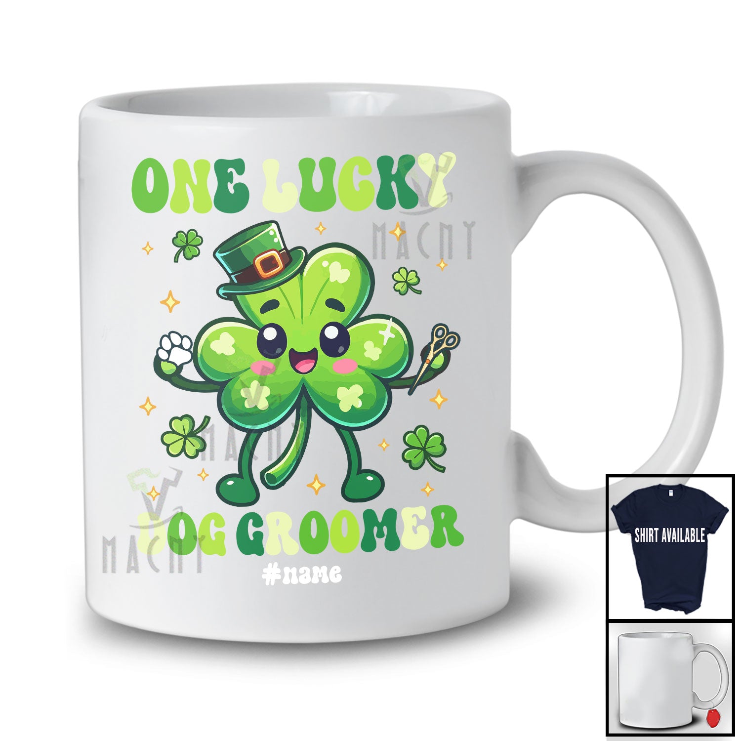 • Personalized One Lucky Dog Groomer; Awesome St. Patrick's Day Custom Name Irish Shamrocks T-Shirt. This cotton t-shirt is a durable staple product with a classic fit. One of the most popular items, it has a relaxed style made for everyday and casual wear.