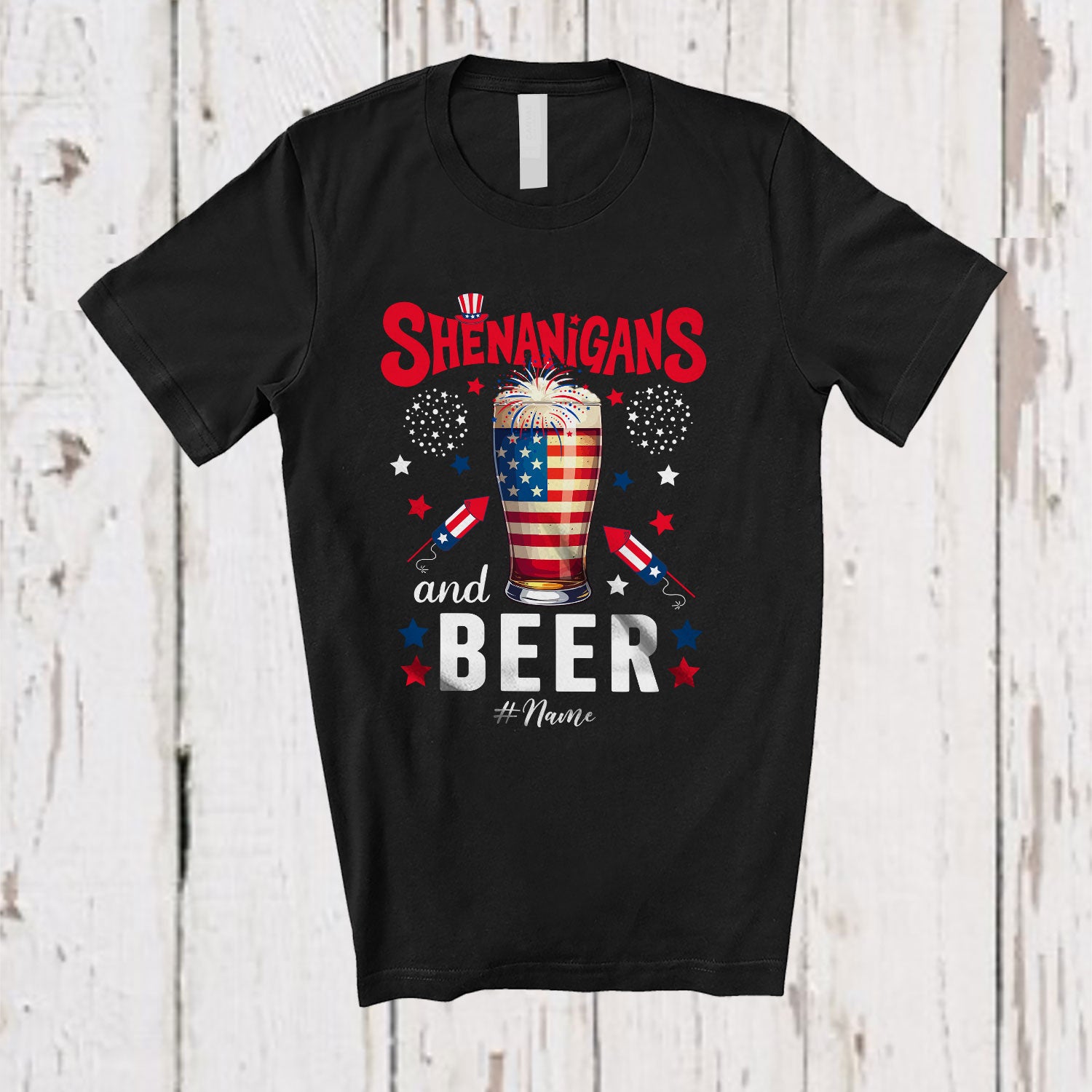 • Personalized Shenanigans And Beer; Lovely 4th Of July Custom Name Drink Beer; Patriotic T-Shirt. This cotton t-shirt is a durable staple product with a classic fit. One of the most popular items, it has a relaxed style made for everyday and casual wear.
