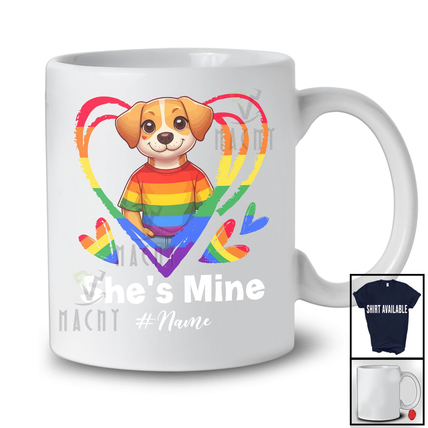 Personalized She's Mine I'm Hers; Lovely LGBTQ Gay Rainbow Heart Dog; Custom Name Couple T-Shirt. This cotton t-shirt is a durable staple product with a classic fit. One of the most popular items, it has a relaxed style made for everyday and casual wear.