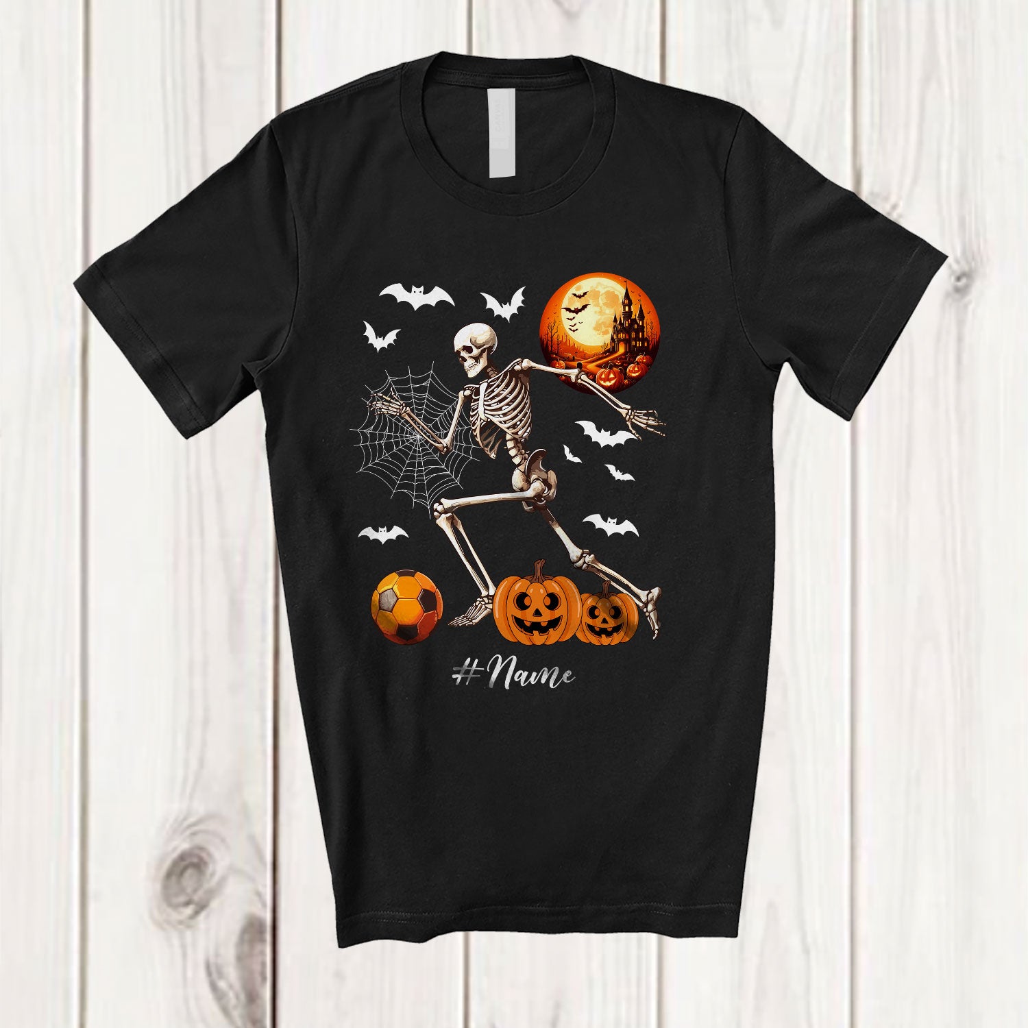 Personalized Skeleton Playing Soccer; Joyful Halloween Moon Custom Name Sport Player Team T-Shirt