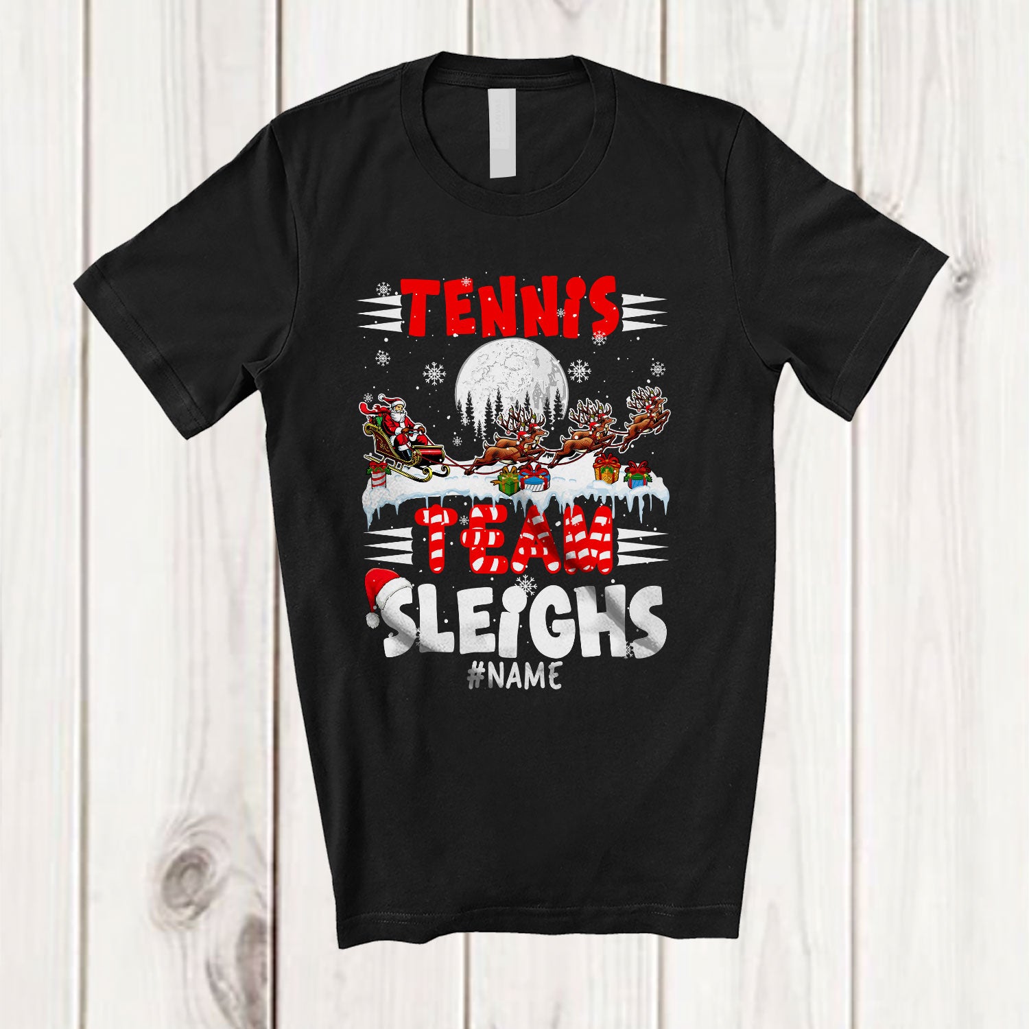 Personalized Tennis Team Sleighs; Joyful Christmas Santa Sled Reindeer; Custom Name Sport Player T-Shirt. This cotton t-shirt is a durable staple product with a classic fit. One of the most popular items, it has a relaxed style made for everyday and casual wear.