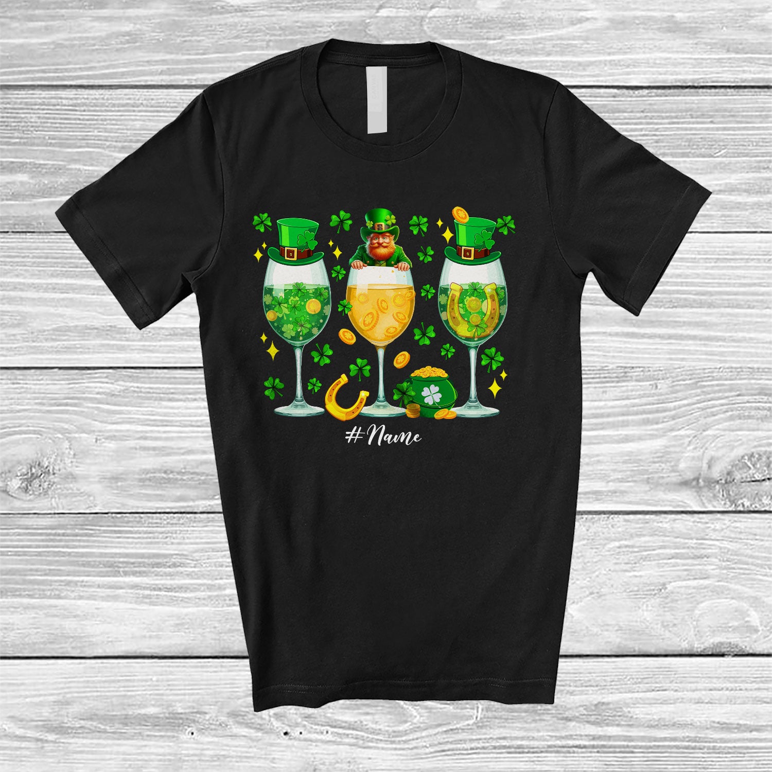 • Personalized Three Wine Glasses; Fantastic St. Patrick's Day Custom Name Drinking; Shamrocks T-Shirt. This cotton t-shirt is a durable staple product with a classic fit. One of the most popular items, it has a relaxed style made for everyday and casual wear.