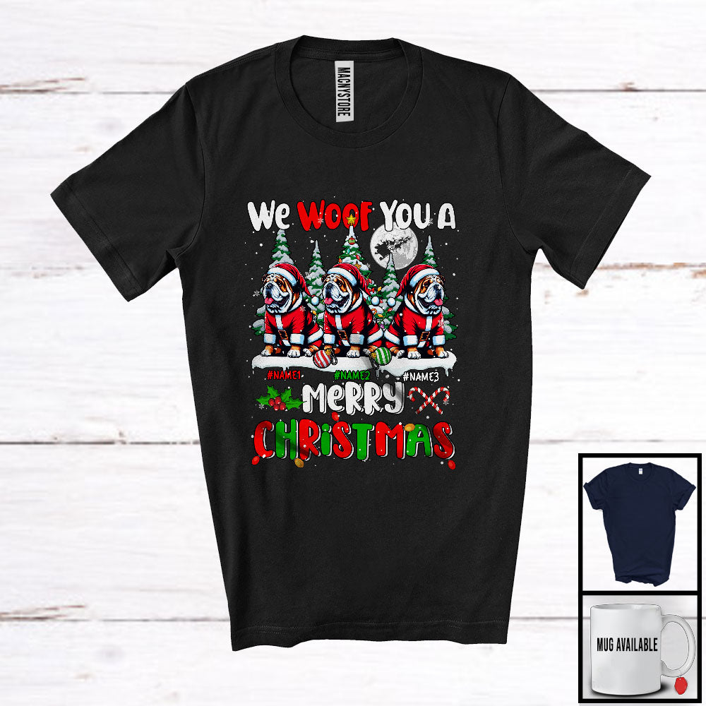 Personalized We Woof You A Merry Christmas; Lovely Three Santa Bulldogs; X-mas Tree T-Shirt