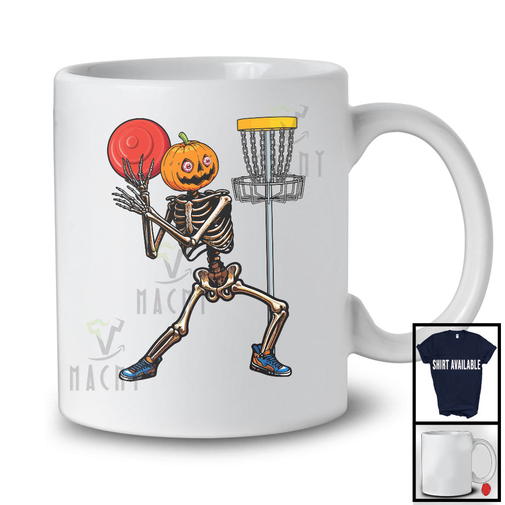 Pumpkin Skeleton Playing Disc Golf; Creepy Halloween Costume Sport Player Team; Family Group T-Shirt. This cotton t-shirt is a durable staple product with a classic fit. One of the most popular items, it has a relaxed style made for everyday and casual wear.
