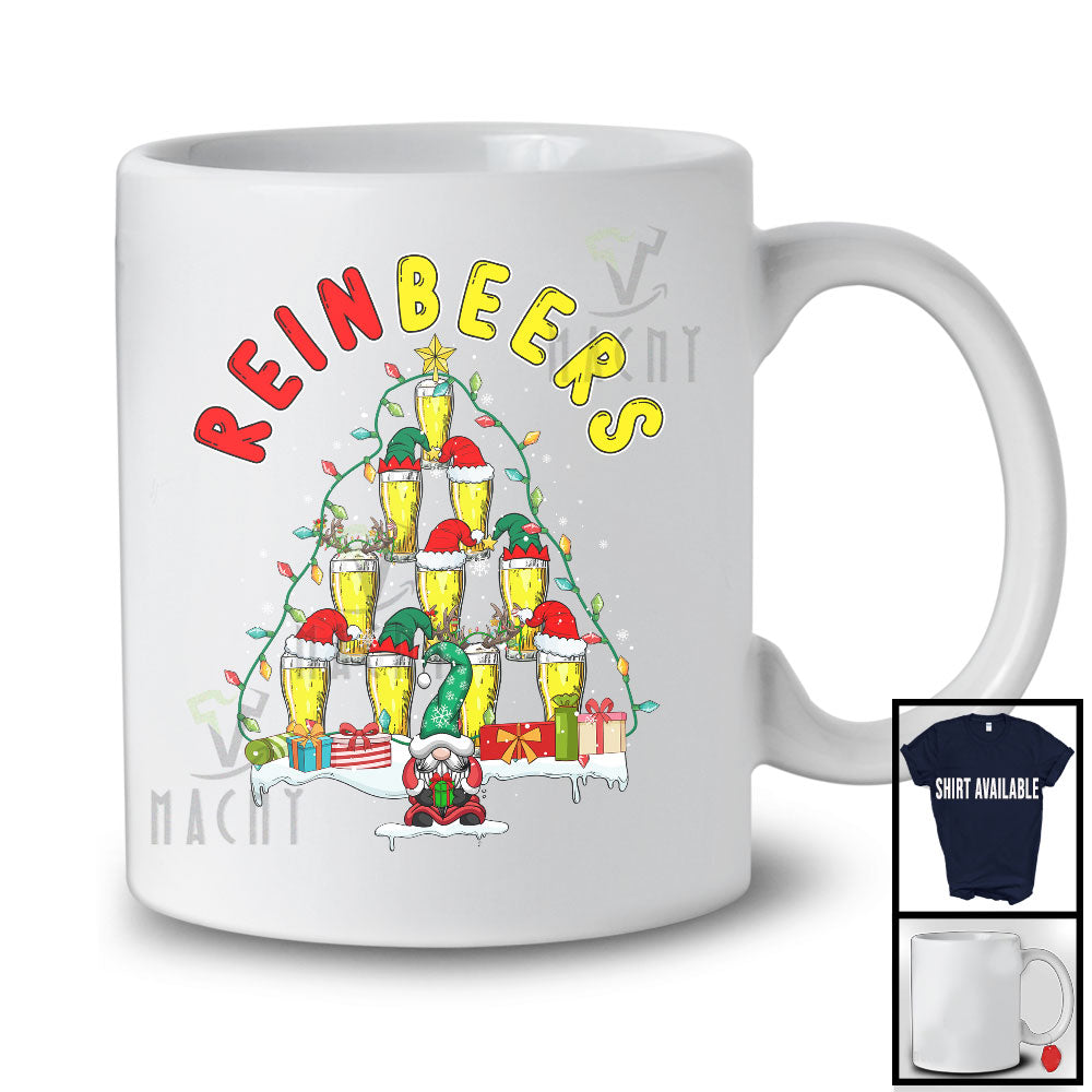 Reinbeers; Humorous Christmas Tree Beer Glasses Reindeer Snowing; Drinking Drunker Group T-Shirt. This cotton t-shirt is a durable staple product with a classic fit. One of the most popular items, it has a relaxed style made for everyday and casual wear.