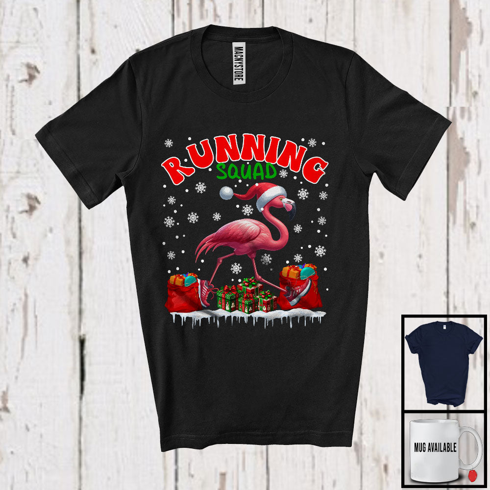 • Running Squad, Joyful Christmas Snow Santa Flamingo Running, Marathon Runner Group T-Shirt. This cotton t-shirt is a durable staple product with a classic fit. One of the most popular items, it has a relaxed style made for everyday and casual wear.