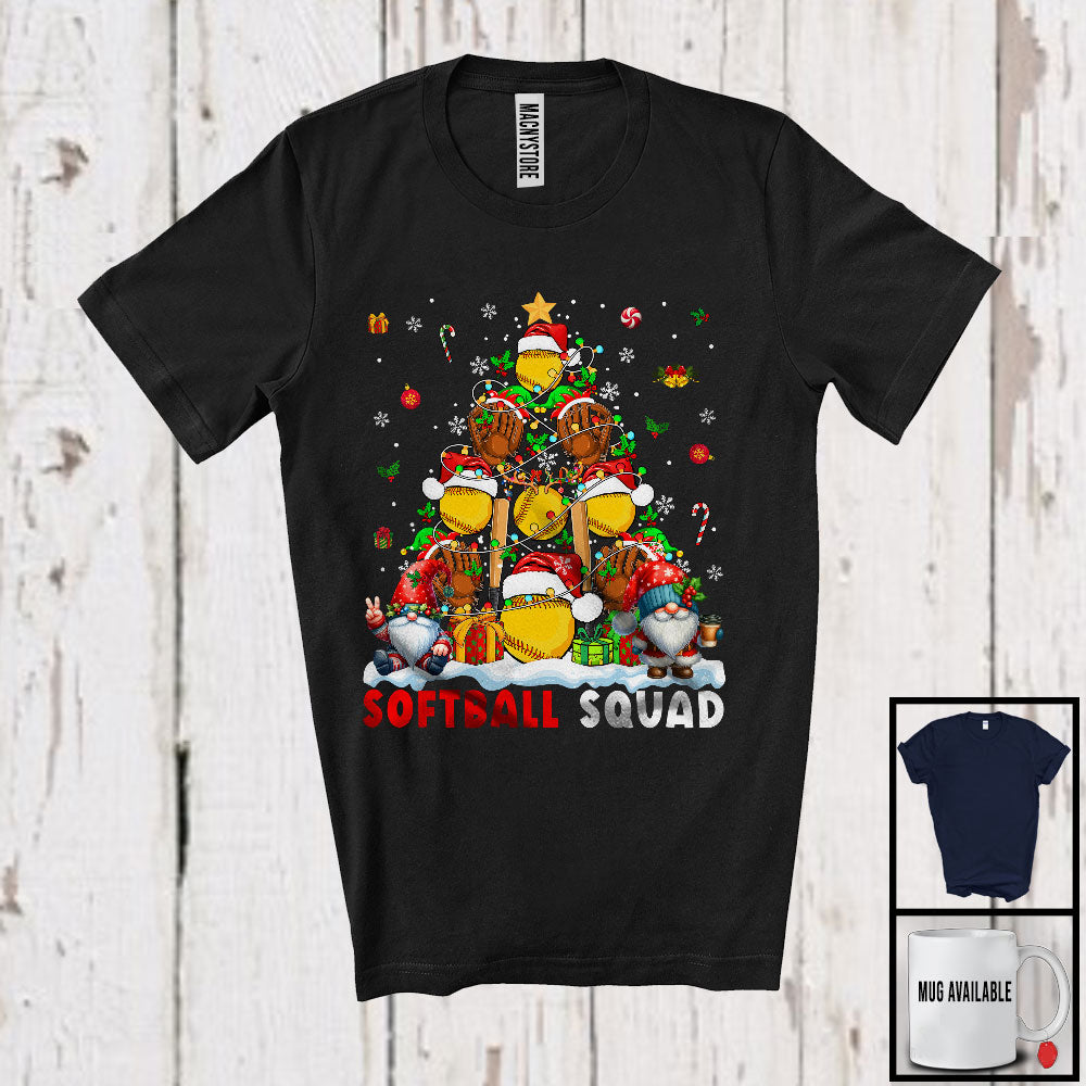 Softball Squad; Lovely Softball Equipment Christmas Tree Lights; Sport Player Playing Gnomes T-Shirt. This cotton t-shirt is a durable staple product with a classic fit. One of the most popular items, it has a relaxed style made for everyday and casual wear.