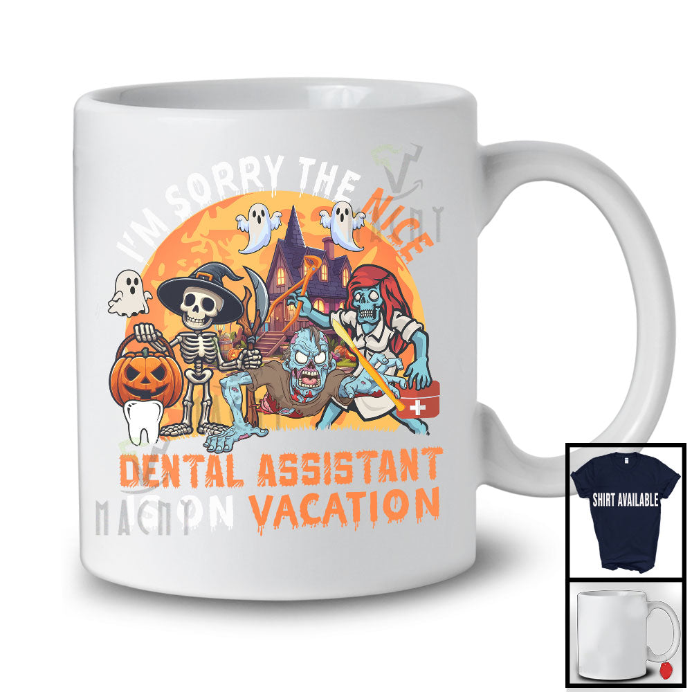 • Sorry The Nice Dental Assistant Is On Vacation, Sarcastic Halloween Zombie, Skeleton Pumpkin T-Shirt. This cotton t-shirt is a durable staple product with a classic fit. One of the most popular items, it has a relaxed style made for everyday and casual wear.