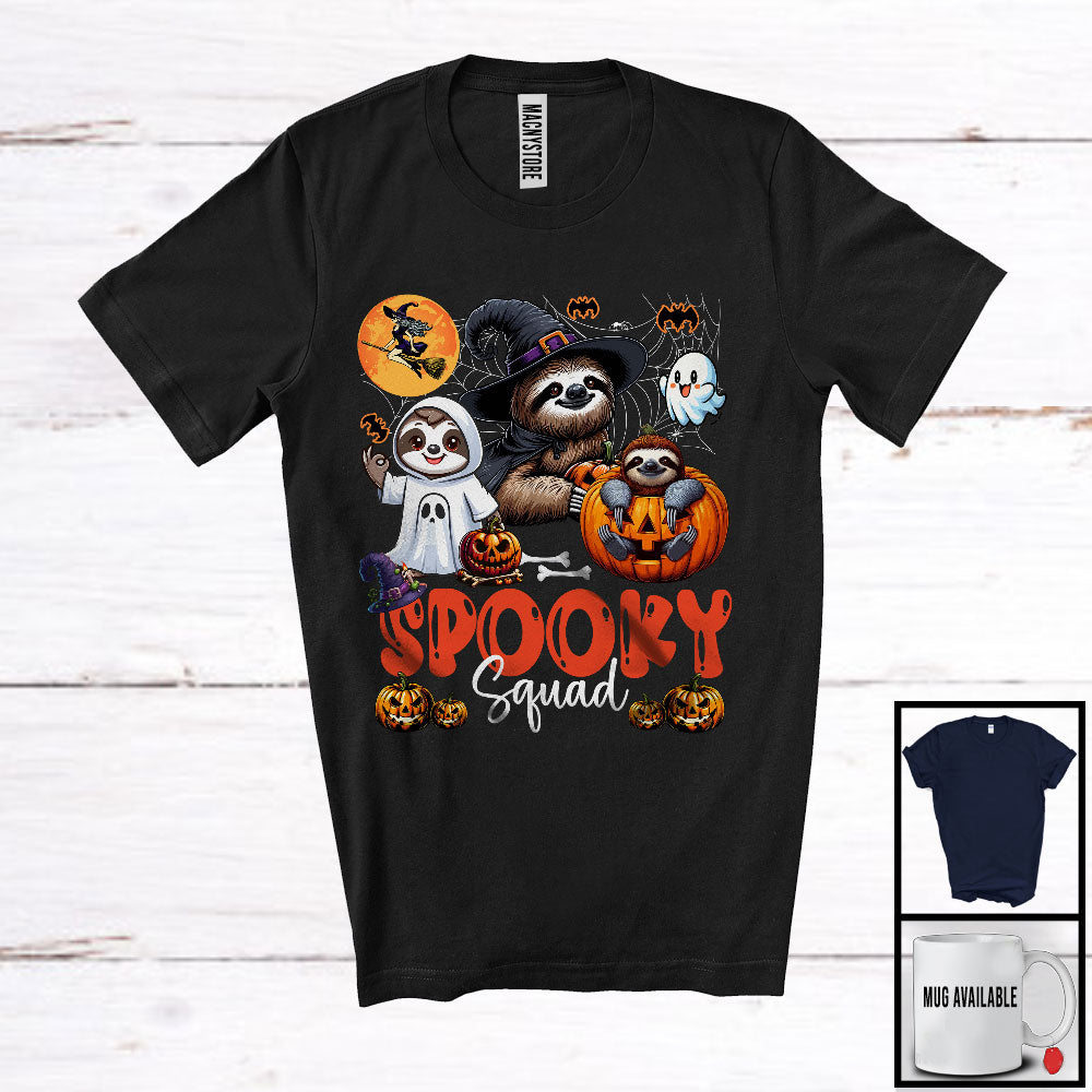 Spooky Squad, Scary Halloween Costume Three Witch Boo Ghost Sloth, Pumpkin Animal Lover T-Shirt. This cotton t-shirt is a durable staple product with a classic fit. One of the most popular items, it has a relaxed style made for everyday and casual wear.