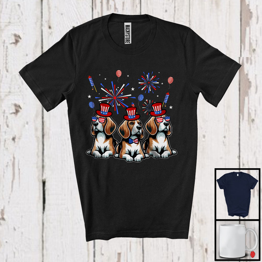 Three Beagle Dogs With USA Flag Glasses, Cool 4th Of July Fireworks USA Flag, Patriotic T-Shirt