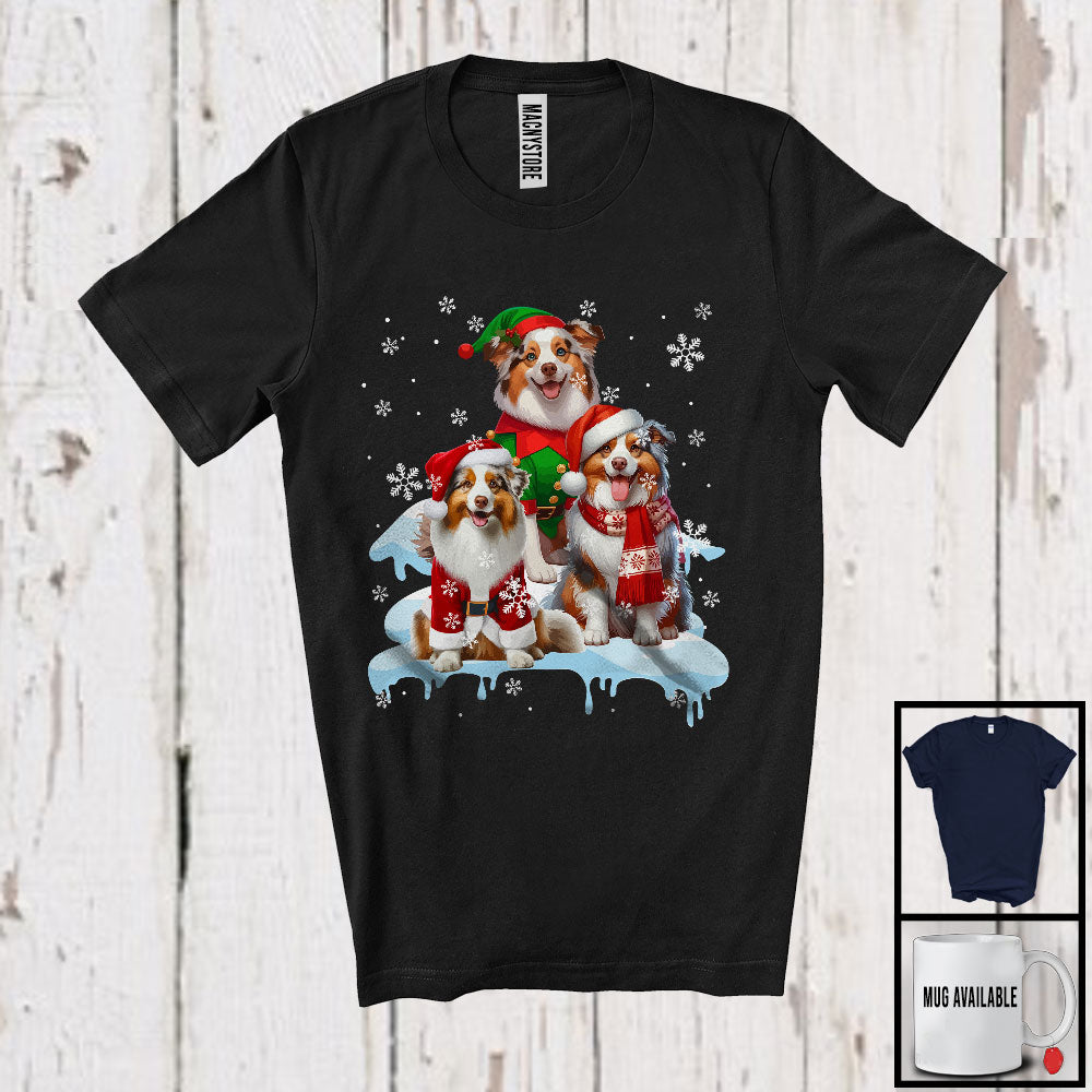 Three Santa Elf Australian Shepherds On Snow; Adorable Christmas Snowing Dog; Family Group T-Shirt
