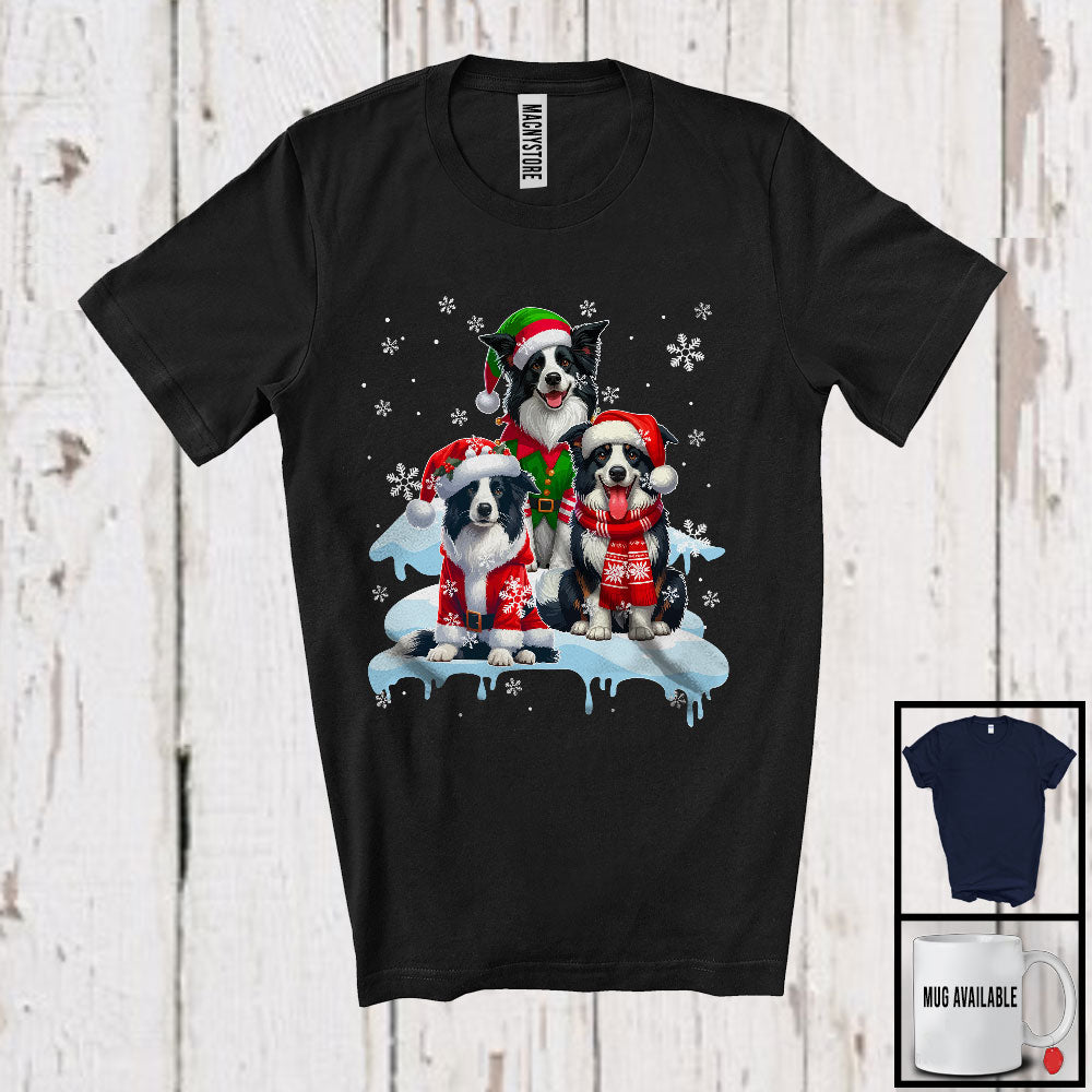 Three Santa Elf Border Collies On Snow; Adorable Christmas Snowing Dog; Family X-mas Group T-Shirt