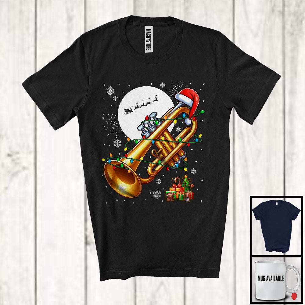 Trumpet Santa; Amusing Christmas Lights Snowing Santa Trumpet Player; Musical Instruments T-Shirt