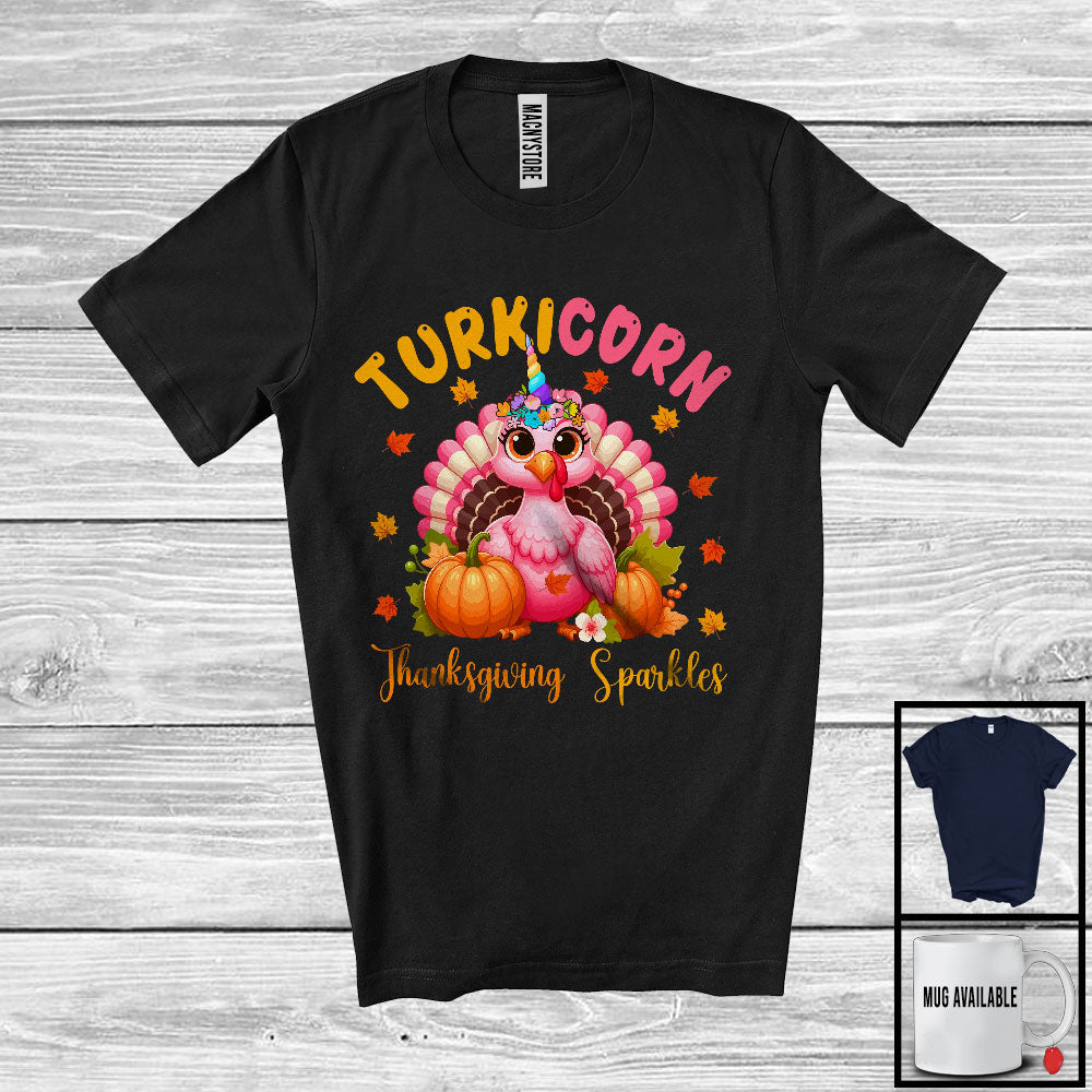 Turkicorn Thanksgiving Sparkles; Awesome Thanksgiving Turkey Unicorn; Girls Flowers Pumpkin T-Shirt. This cotton t-shirt is a durable staple product with a classic fit. One of the most popular items, it has a relaxed style made for everyday and casual wear.