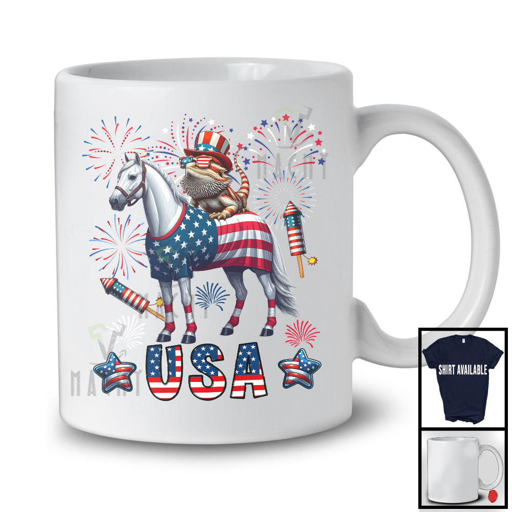 USA, Awesome 4th Of July Bearded Dragon Riding Horse, American Flag Fireworks Animal T-Shirt