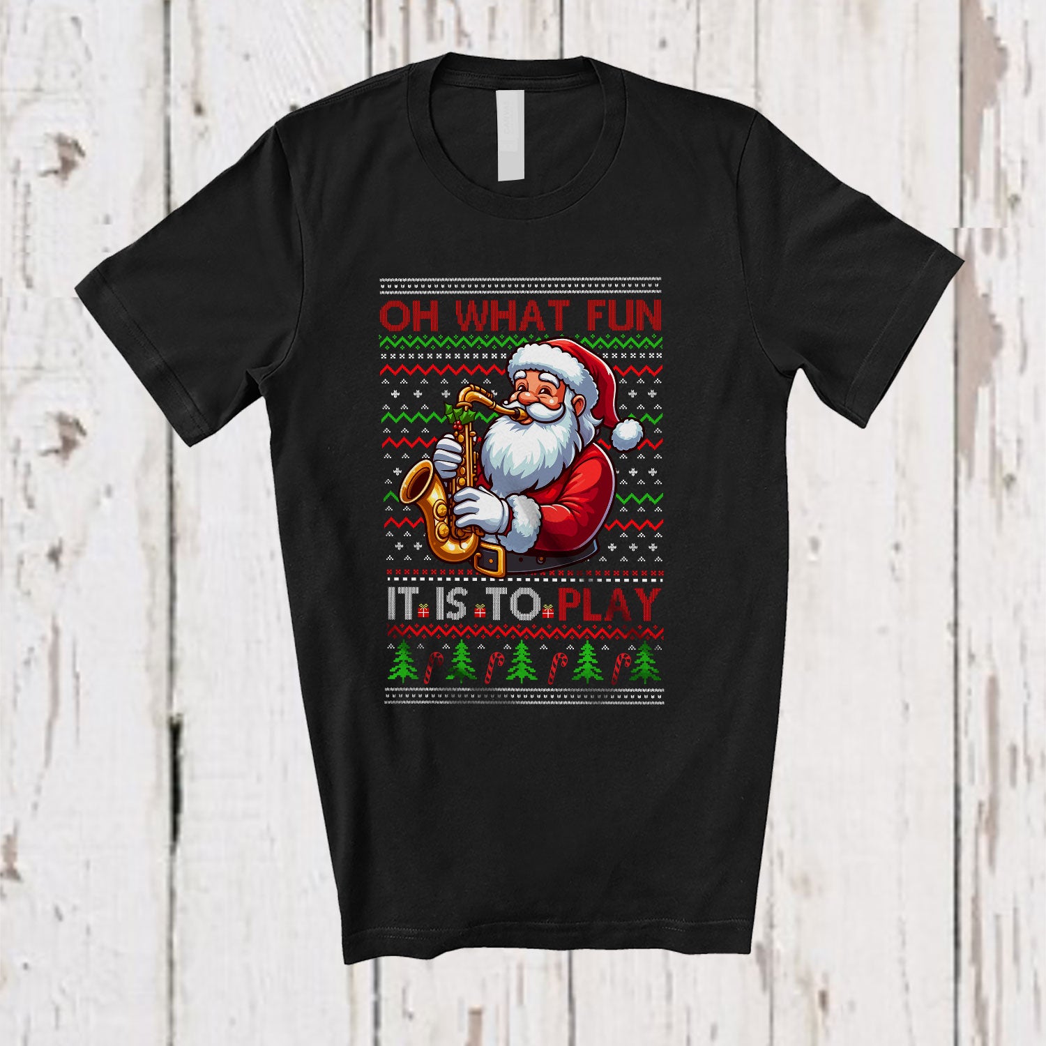 The What Fun It Is To Play; Joyful Christmas Santa Playing Saxophone Player; Sweater Sport Team T-Shirt destined to impress, and priced at only $12.95, for a limited time.
