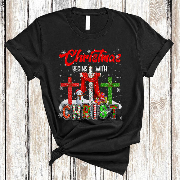 Christmas Begins With Christ, Colorful X-mas Three Christ Crosses, Snowman Snow Around T-Shirt