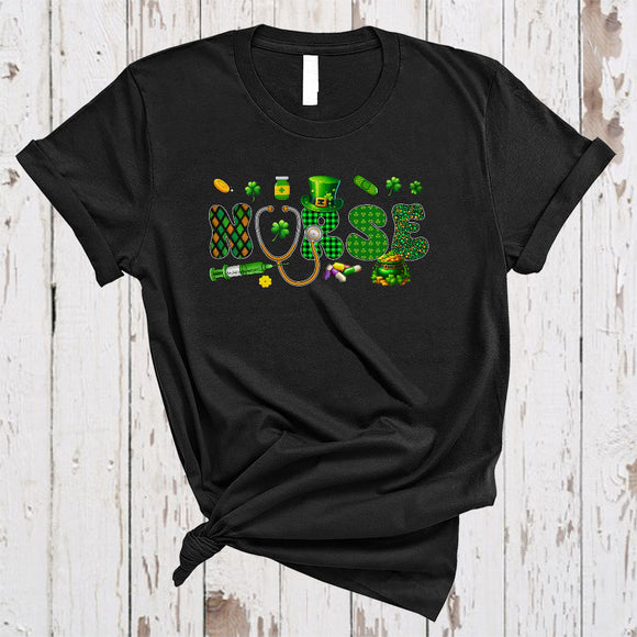 Nurse, Cheerful St. Patrick's Day Plaid Irish Lucky Shamrocks, Stethoscope Nursing Squad T-Shirt