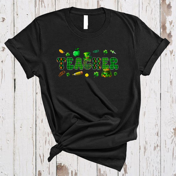 Teacher, Cheerful St. Patrick's Day Plaid Irish Lucky Shamrocks, Matching Teacher Squad T-Shirt