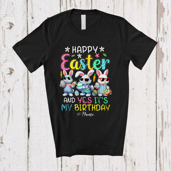 Personalized Happy Easter And Yes It's My Birthday; Adorable Custom Name Three Bunnies Eggs T-Shirt